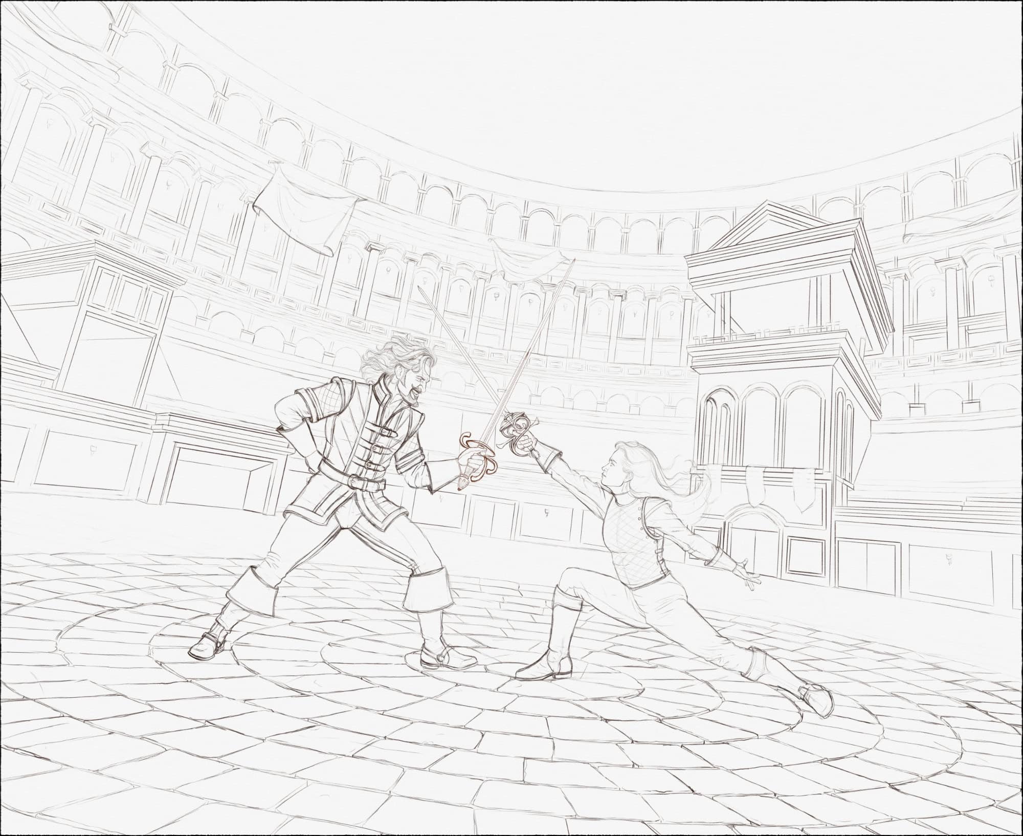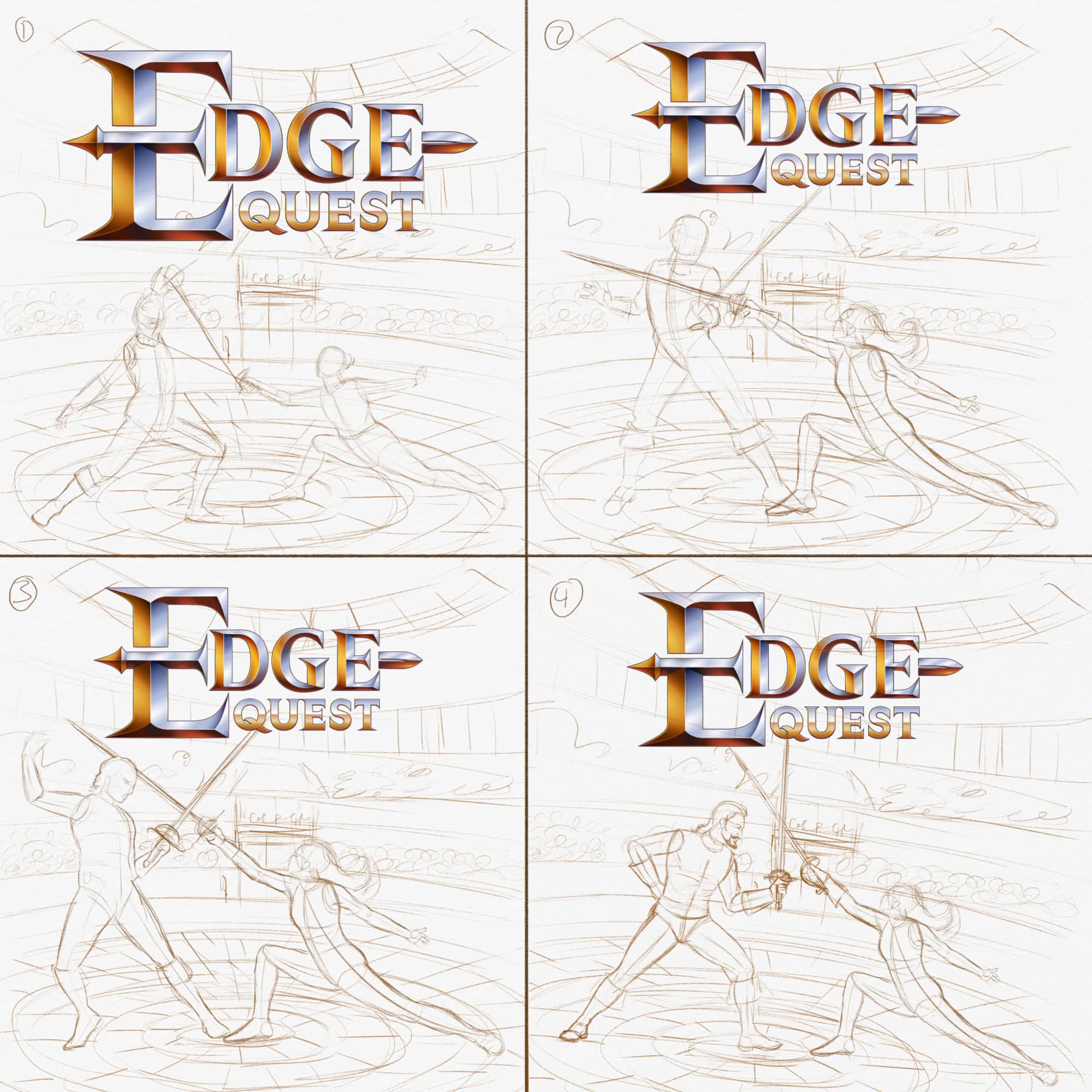 I created this illustration as the official cover art for Edge Quest. The goal was to grab attention and to set the tone for the game by showcasing two combatants in a fantasy-style arena. It’s just a glimpse of the adventure that awaits those bold enough to play. Below is a glimpse at the process, I started with some thumbnails, moving to a finished linedrawing, and a value study before beginning the final illustration.
