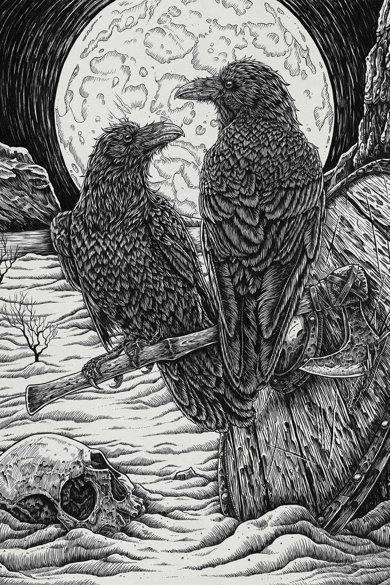Ravens, Vikings, Norse Culture, Mythology, and Lore, have always held a special place in my heart. I planned and thought about this illustration for several years before I finally began the physical work of it. I decided to expand my knowledge of Norse culture and did more research on Huginn and Muninn themselves. As I read my vision for this illustration expanded and grew into what would be this final piece of art.