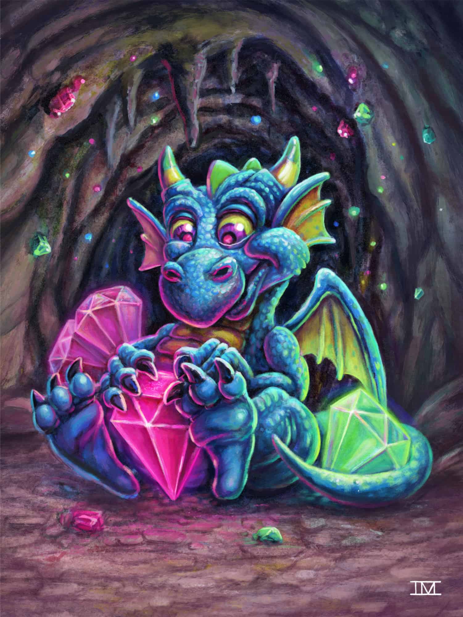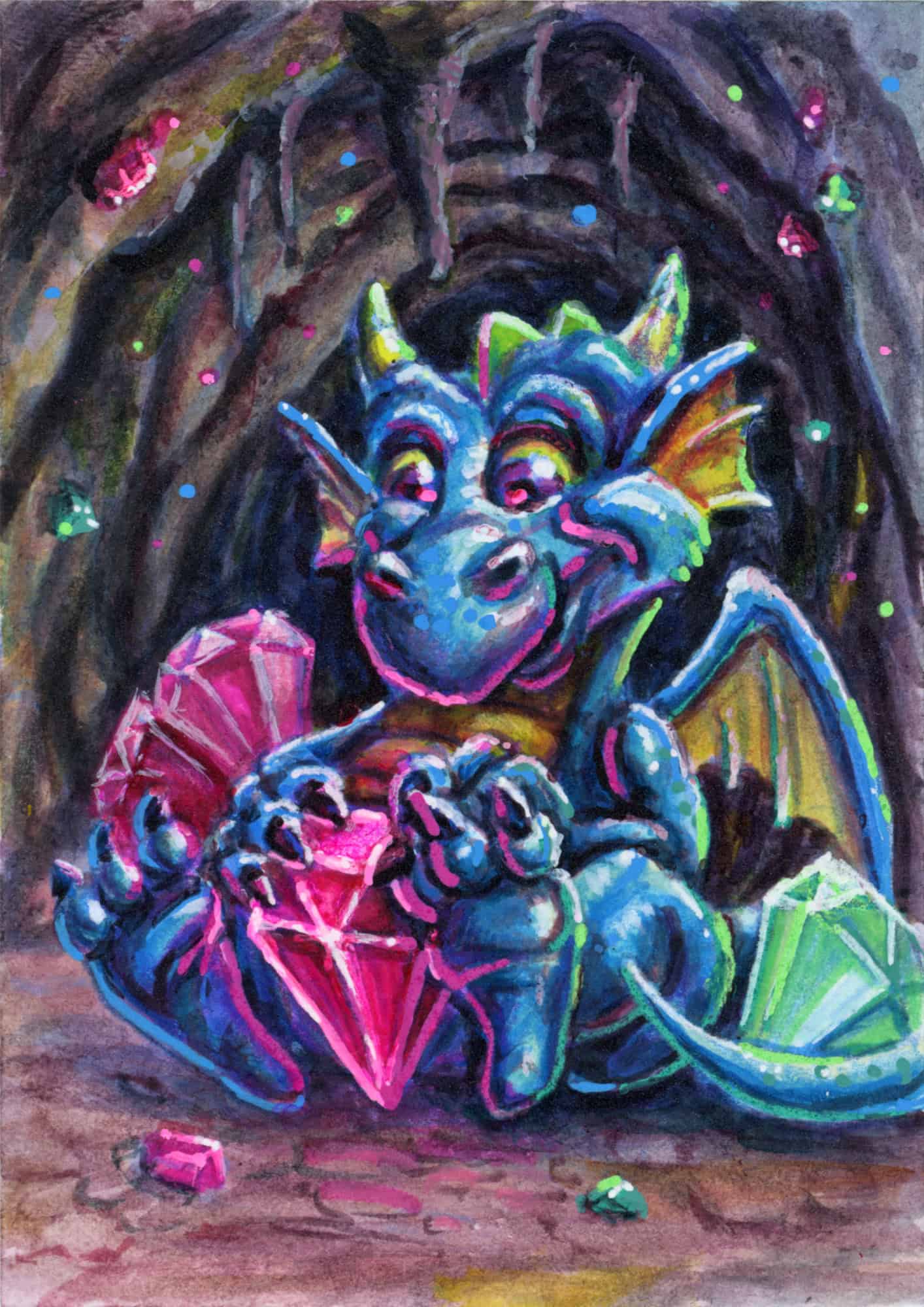 A subscriber asked me to sketch a baby dragon on my Twitch stream. I loved the sketch so much, I just had to finish it. I did a 2.5×3.5 mini original artist trading card, then scanned it and reworked it digitally.