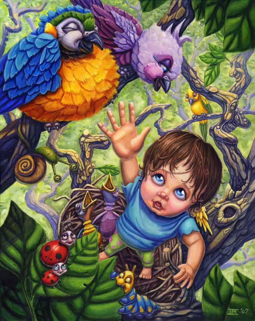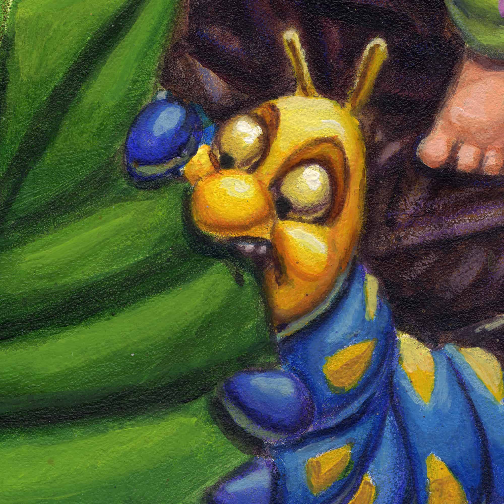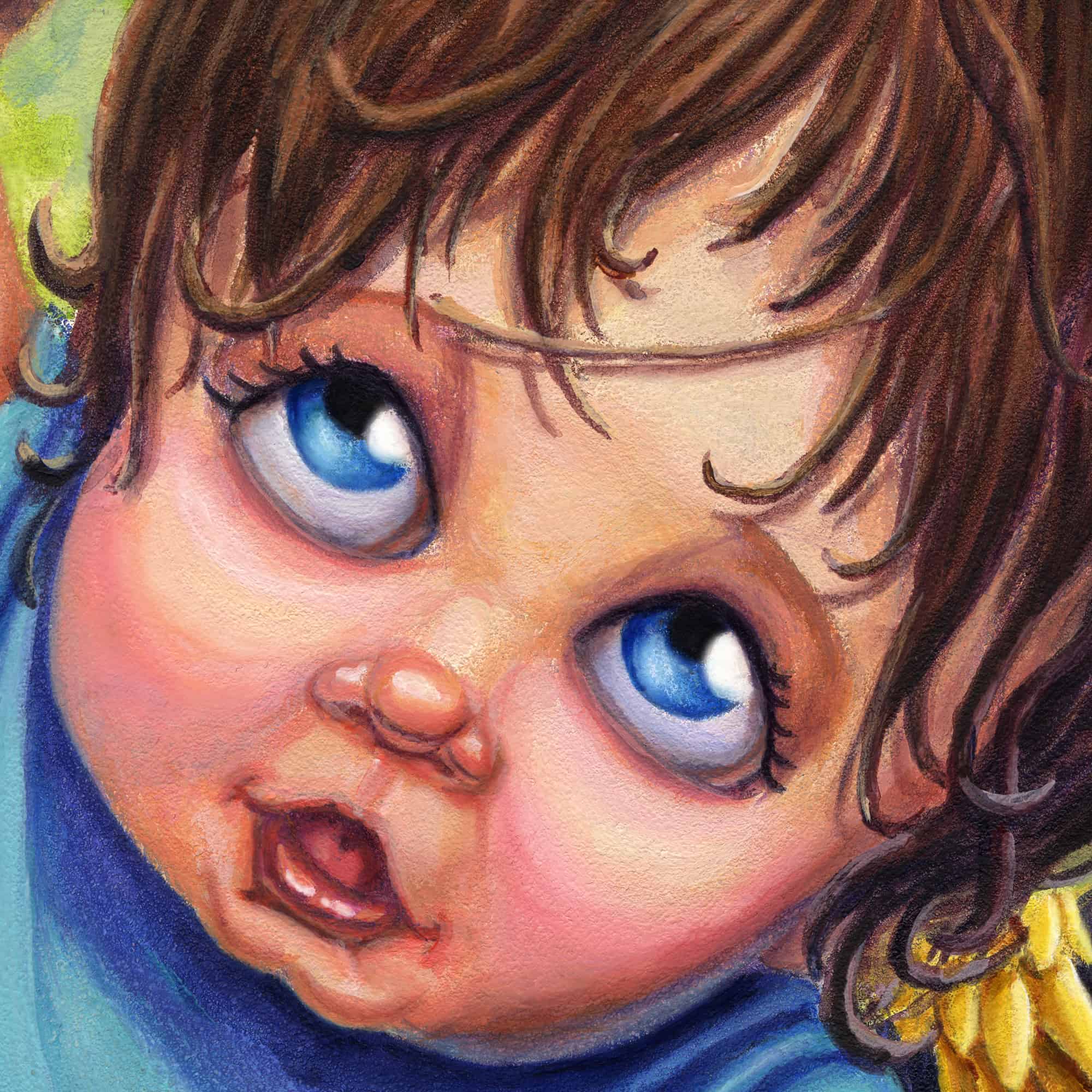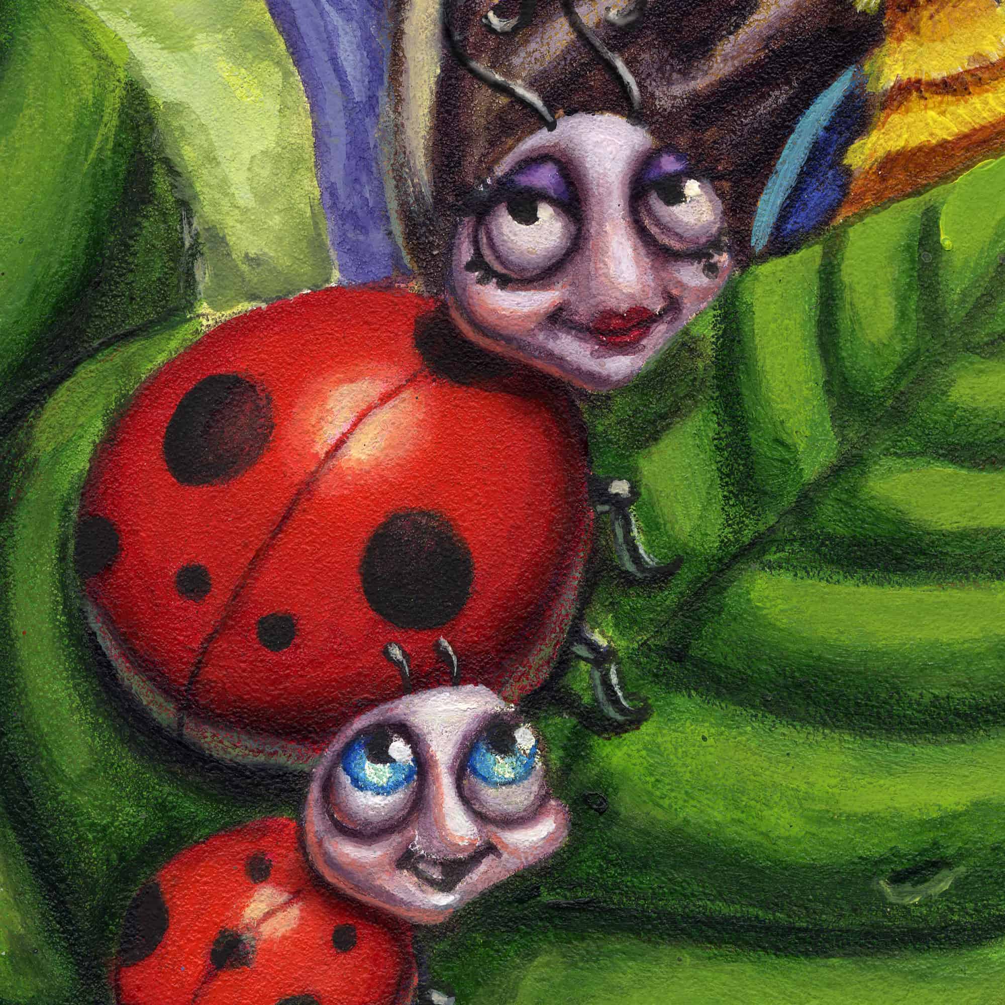 This was an incredibly fun project for me. A mother had a unique request for a whimsical, non-traditional portrait of her 1-year-old that would grow with her child. The goal was to create the artwork in my distinctive and fun, children’s illustration style. I painted this playful portrait with the child’s preferences for bugs, birds, and vibrant colors in mind. The process included initial sketches, concept development, refining line drawings, and color composition before the final painting came to life. Take a look at the concept process and detail images below. Need a special commission tap “Let’s Talk!” below.