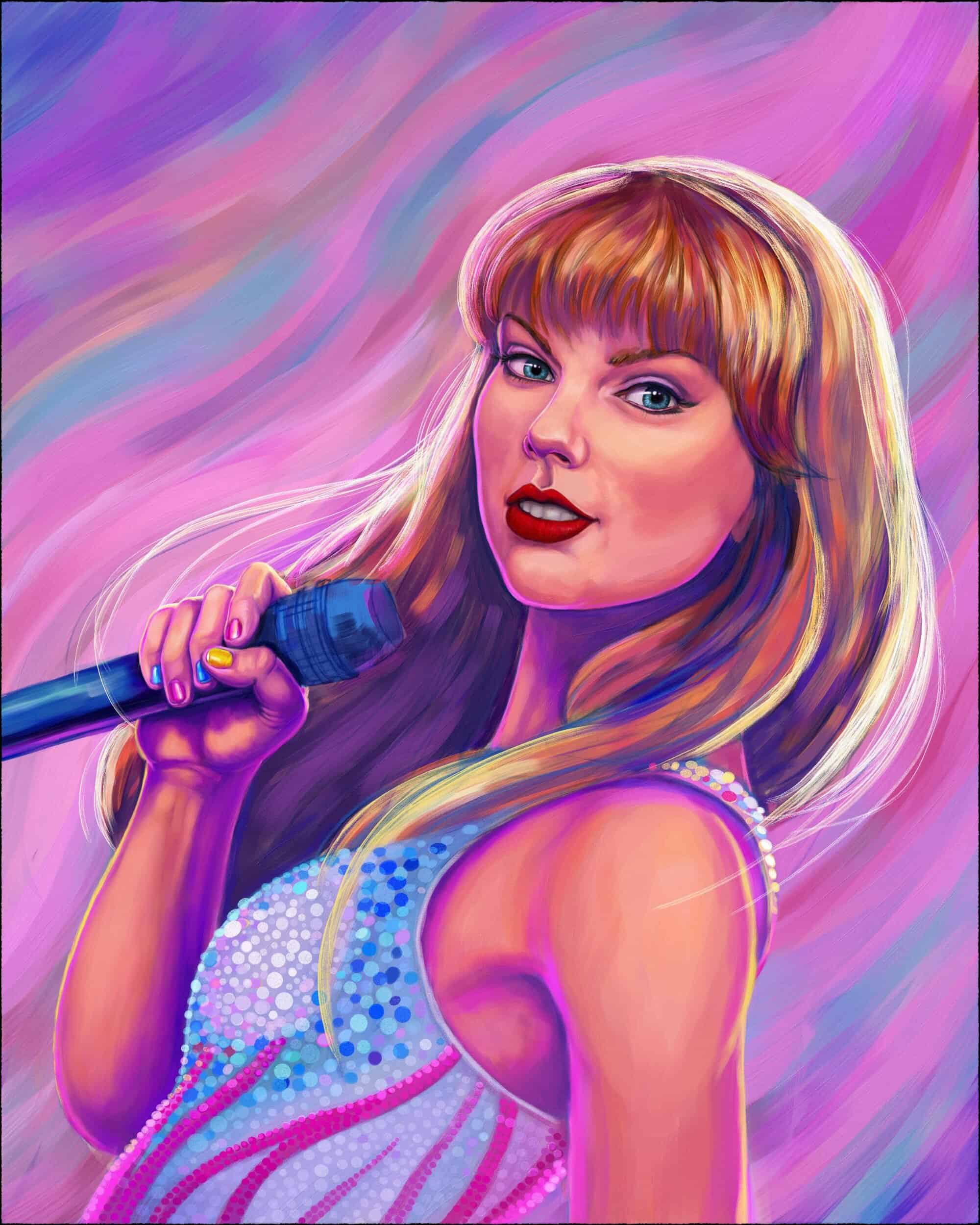 My wife and daughter are both Taylor Swift fans, I created this artwork for them and all the Swifties out there. We watched the Eras Tour (on Netflix) together and I pulled much of my inspiration from that, especially that unforgettable opening. TSwift is a strong woman filled with joy in her performances and I wanted to capture that along with her creativity and playfulness.