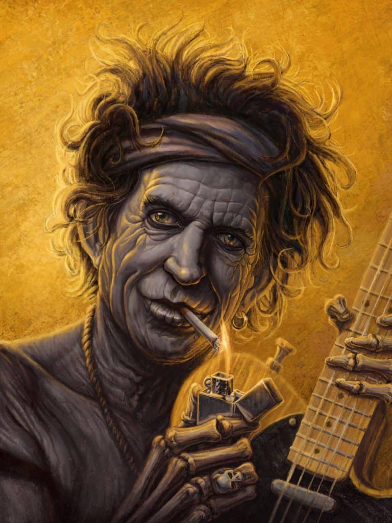 The background color is inspired by Keith’s iconic Butterscotch Fender Telecaster. I wanted something that felt like it was a part of his persona, that would really grab your attention from across the room. I knew I wanted to paint Keith in muted grey tones I thought those would play nicely with the idea of the guitar as color inspiration. The skeleton hands gripping the lighter and his famous Telecaster are designed to push the concept of we’re all the same under the skin further. They also add a nice balance to the piece. The jagged appearance of the tear revealing the skull is inspired by one of Keith’s guitar straps with a lightning bolt on it.